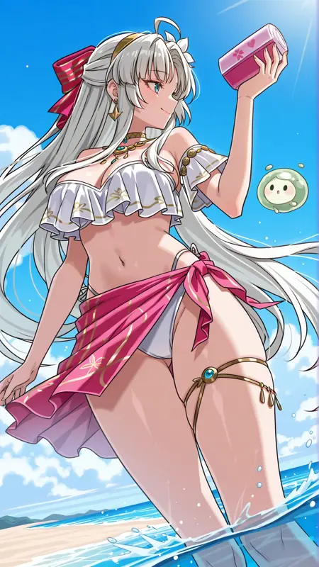 머리: carlotta (splashing summer) (wuthering waves), 1girl, solo, 매우 긴 회색 머리, 중간으로 갈라진 앞머리, ahoge, 빨간 헤어밴드, 머리 장식(헤어 리본+리본), 회색 눈, 미소, 뺨에 붉은 기
