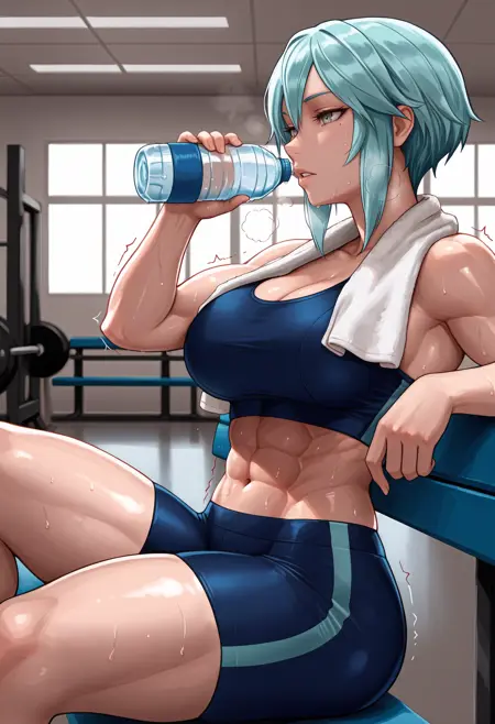 항상 필요: "회색 눈, 아쿠아색 머리, 짧은 머리, 눈 사이의 머리카락, 적당한 가슴, 근육質, (눈 밑 주근깨:0.9)" — 정확도를 위해 항상 필요합니다.