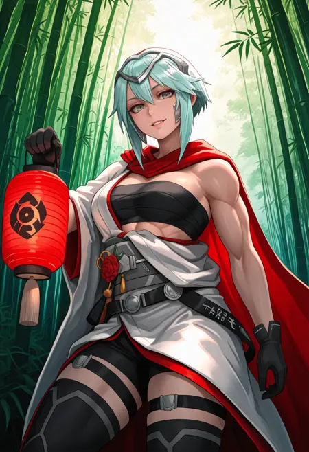 신년 의상: "은색 헤드피스, 빨간 망토, 한쪽 어깨 노출, 한쪽 팔 노출, 검정 가슴 사라시, 흰색 기모노, 하다누기 도우사, 짧은 소매, 검정 장갑, 회색 띠, 허벅지 끈, 검정 허벅지 양말"