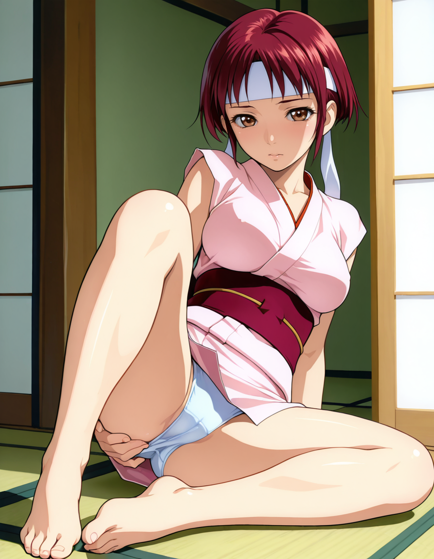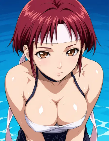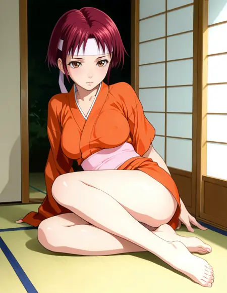 Kaede, 1girl, mature female, short hair, red hair, brown eyes, headband, breast,