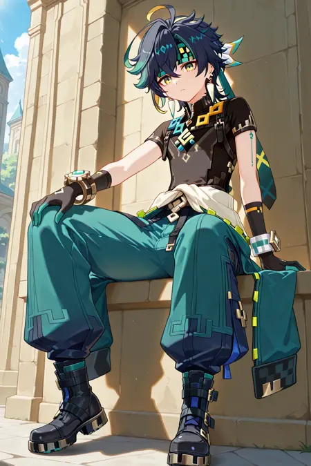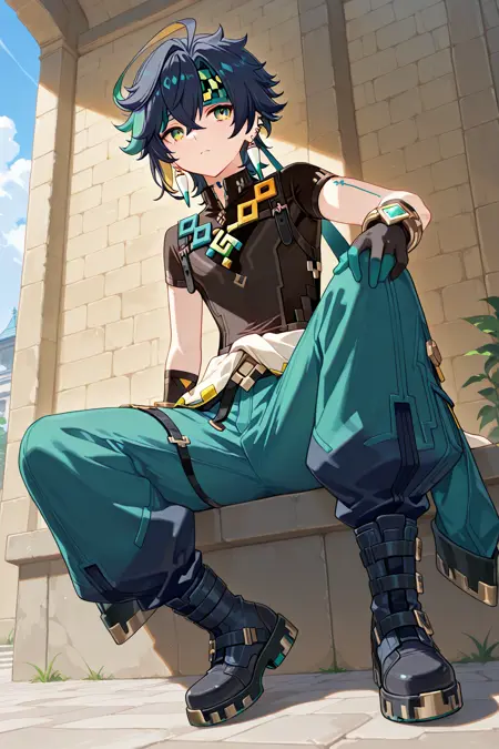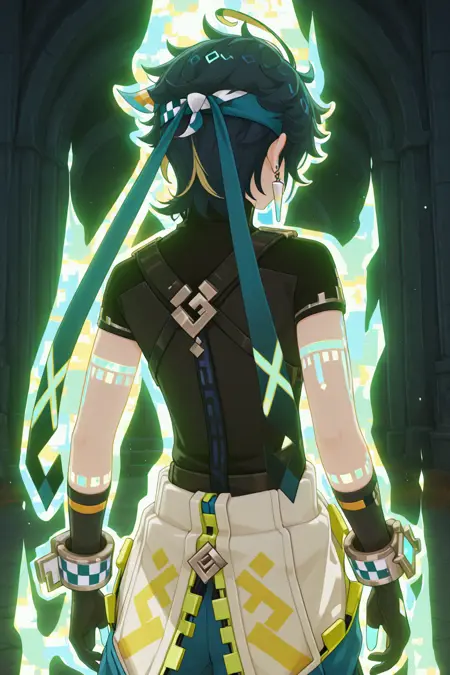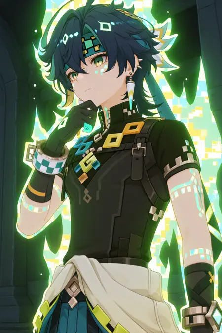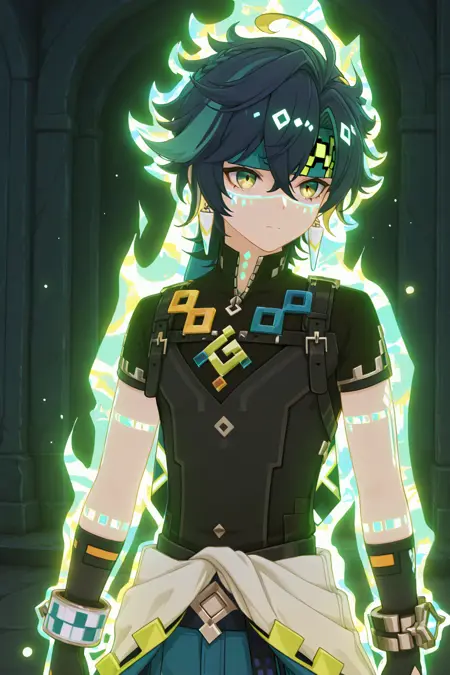 | 학습된 단어 | kinich, gradient eyes, green eyes, yellow eyes, multicolored hair, black hair, green hair, multicolored_eyes, headband, hair_ribbon, tattoo, neck_tattoo, arm_tattoo, necklace, blonde_hair, short_sleeves, clothes_around_waist, coat_around_waist, feather_hair_ornament, black_shirt, belt, gloves, earrings, bracelet, jewelry, braid, zipper, baggy_pants, boots,복사됨! nightsoul, glowing, aura, light_particles, glowing_tattoo, facial_tattoo, glowing_eyes, glowing,복사됨! |
