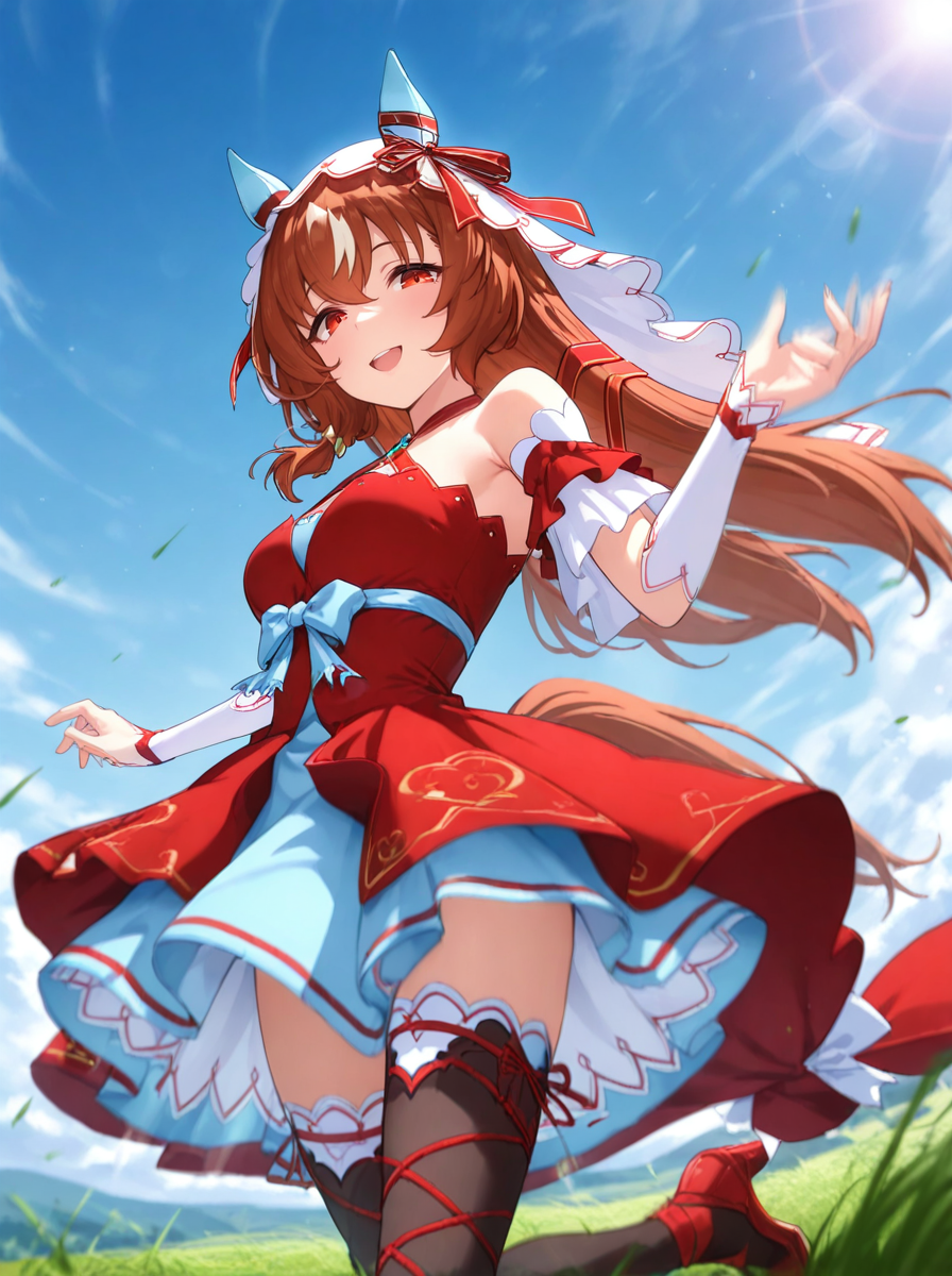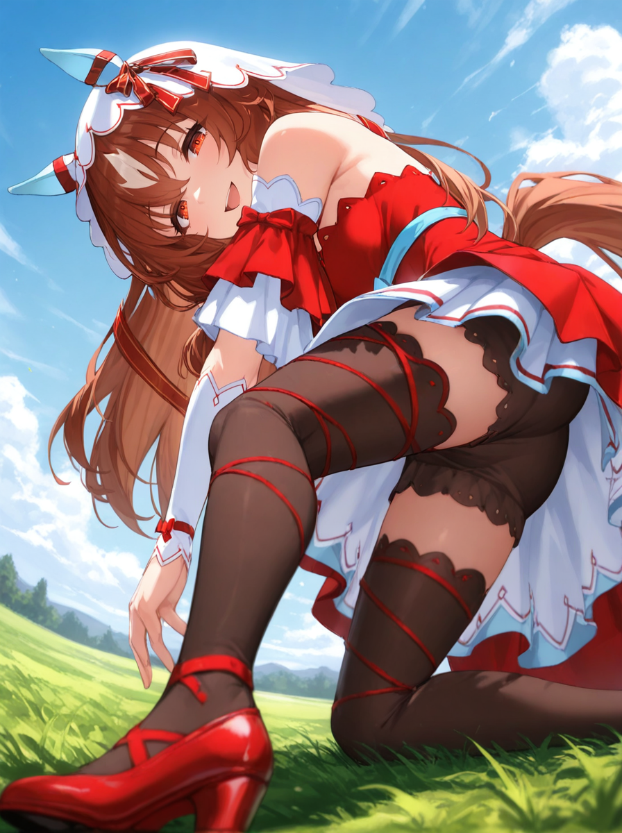 • horse ears, horse tail,red high heels, light blue ear covers, white veil, red criss-cross halter high-low skirt dress,bare shoulders, red ribbon brown thighhighs, white detached sleeves, ears through headwear, red hair ribbon, high waist light blue ribbon, layered light blue miniskirt,