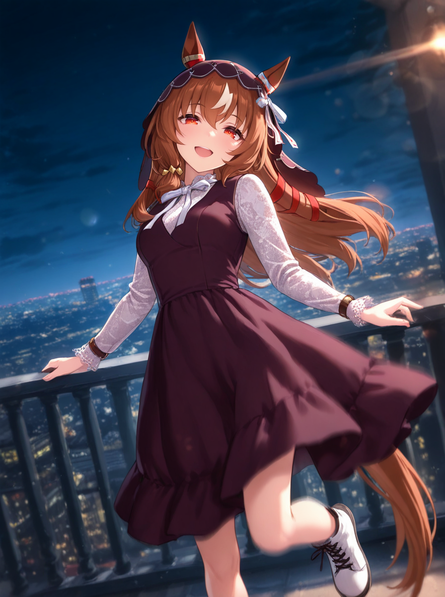 • horse ears, horse tail, white neck ribbon, ears through headwear, long burgundy dress with ruffles, white lace blouse with long sleeves, brown lace-up two-tone ankle boots, burgundy veil, white hair ribbon, bracelet, casual