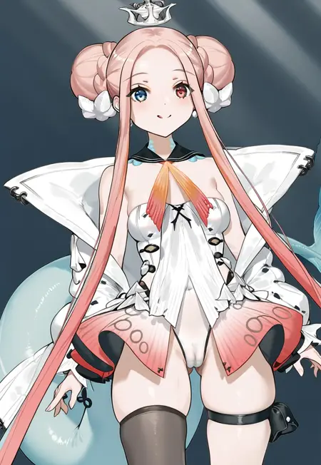 Sumi6, 1girl, solo, 긴 머리, 가슴, 시청자 바라보기, 파란 눈, 허벅지 양말, 드레스, 어깨 노출, 매우 긴 머리, 분홍색 머리, 꼬리, 분홍색 머리, 땋은 머리, 옆머리, 다색 머리, 작은 가슴, 벌어진 옷, 넥타이, 어깨 노출, 머리 묶음, 스트랩 없는, 더블 바인드, 붉은 머리, 그라데이션 머리, 허벅지 스트랩, 분리된 칼라, golden_crown, 몬스터 소녀, 단일 허벅지 양말, 스트랩 없는 드레스, 다색 옷, 이마, 비대칭 하의, 미니 왕관, 물고기 꼬리, 짧은 넥타이, 물고기 소녀, 치마, 하이레그 레오파드, 스트랩 없는 레오파드, 흰색 레오파드, 배꼽 커버, 혀, 이색성 동공, 붉은 눈, black_fingerless_gloves, 드레스, big_pearl_earrings