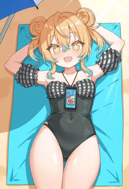 donki girl, 다색 머리, 그라데이션 머리, 금발, 파란 머리, 머리 뭉치, 더블 뭉치, 눈썹 사이 머리, 별 모양 동공, 검은 한 벌 수영복, 측면 슬릿, 어깨 노출, 휴대폰, 작은 가슴, 분리된 소매