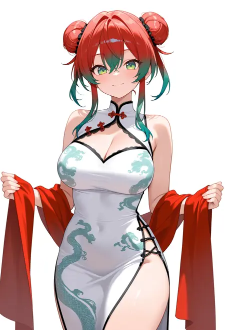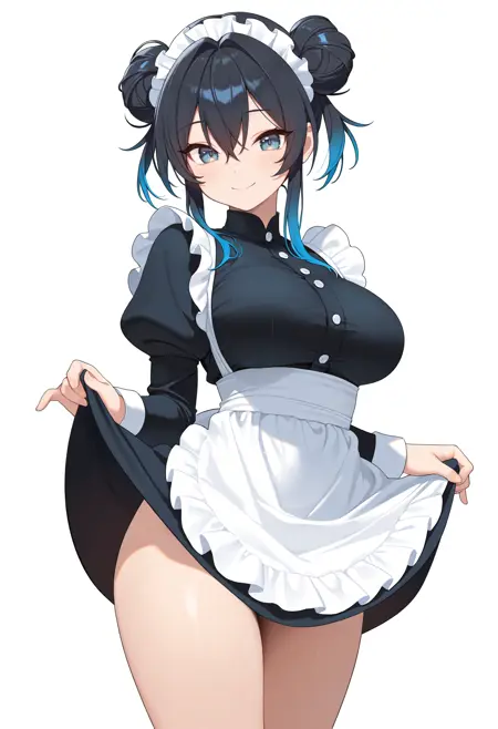donki girl,multicolored hair,gradient hair,blonde hair,blue hair,hair bun,double bun,hair between eyes,star-shaped pupils,black one-piece swimsuit, side slit, bare shoulders, phone,small breasts, detached sleeves,