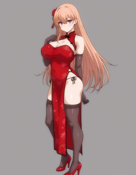 mai_zzchlc_g1,anime_coloring,long_hair,brown_hair,purple_eyes,large_breasts,china_dress,red_dress,hair_ornament,hair_flower,elbow_gloves,thighhighs,red_high_heels