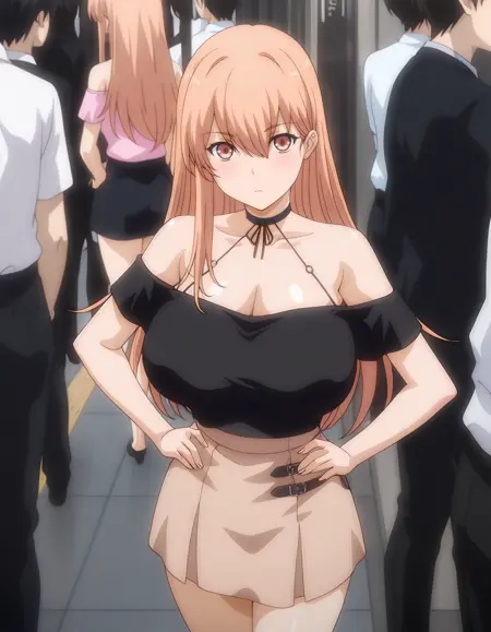 mai_zzchlc_g1,anime_coloring,long_hair,brown_hair,purple_eyes,large_breasts,bare_shoulders,black_choker,sweat,brown_skirt,boots