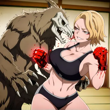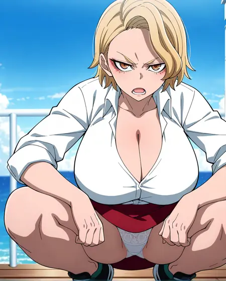 1girl, breasts, skirt, blonde hair, cleavage, solo, short hair,