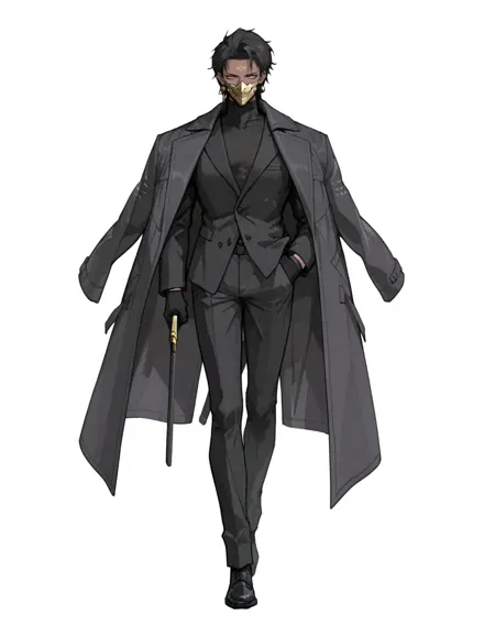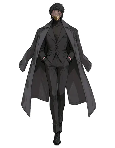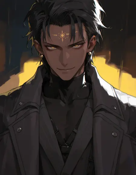 mai_pgr_vonnegut,1boy,short_hair,shirt,black_hair,jacket,male_focus,black_jacket,black_shirt,long_sleeves,jewelry,earrings,dark_skin,forehead_mark,turtleneck,facial_mark,forehead_tattoo,gloves,yellow_eyes,black_gloves,coat,sweater,formal,suit,black_coat,straight-on,black_suit,coat_on_shoulders,golden_mask