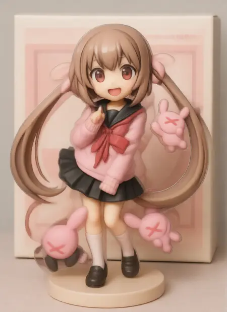Convert the character in the image into a figurine, Behind the figurine is a box displaying artwork of the same character