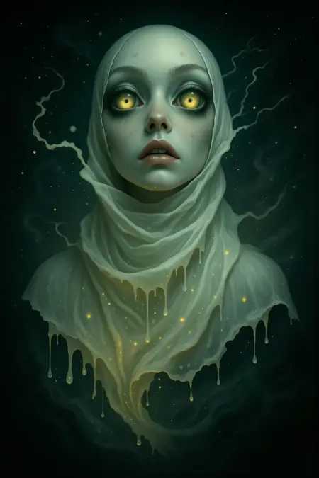 色彩与光线:强调空灵、宇宙般的光照条件。使用“生物荧光”、“晶体”、“闪烁”、“幽灵”等词汇,增强超凡氛围。