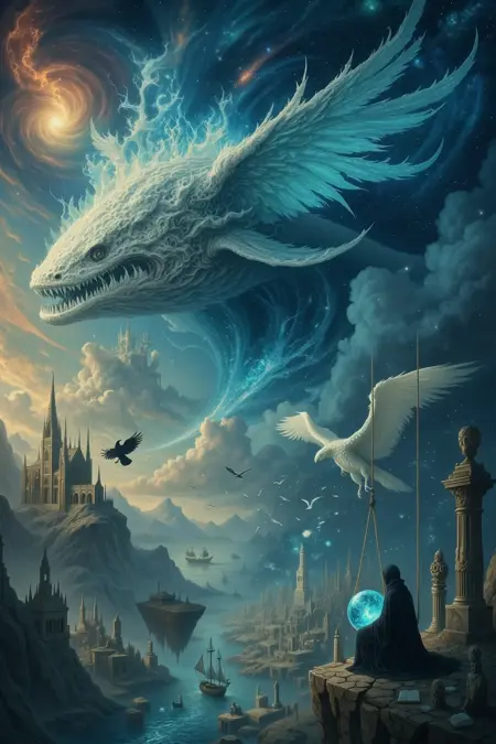 氛围叠加:在提示中融合多重氛围元素——结合天空描述、材质的不可能性与尺度对比。例如:“碎裂镜面天空” + “固化星光” + “巨型漂浮岛屿”。