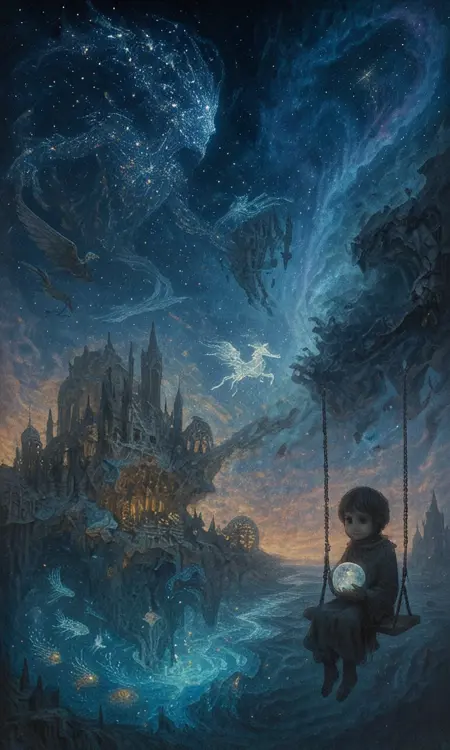 “一个双眼如遥远星辰的孩子,坐在由编织星光构成的秋千上”