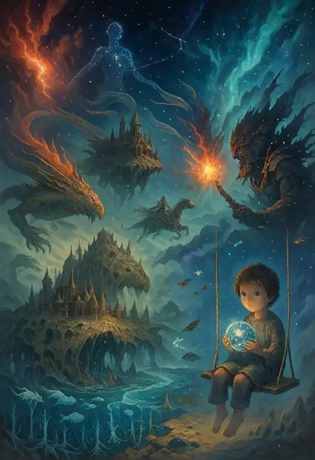 构图焦点:当孩子坐在秋千上作为混乱、不可能景观中的中心稳定元素时,该LoRA表现最佳。孩子宁静与周围宇宙戏剧之间的对比,是其美学的关键。
