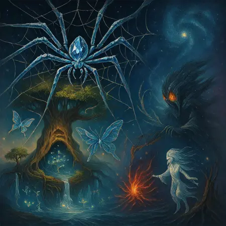 色彩与光线:强调空灵、宇宙般的光照条件。使用“生物荧光”、“晶体”、“闪烁”、“幽灵”等词汇,增强超凡氛围。
