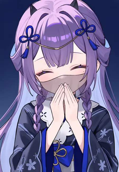 amakawamamushi,cone horns,purple hair,blue colored inner hair,double-parted bangs,twin braids,very long hair,mole under eye,tassel hair ornament,mouth veil