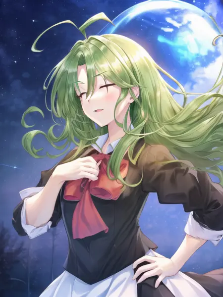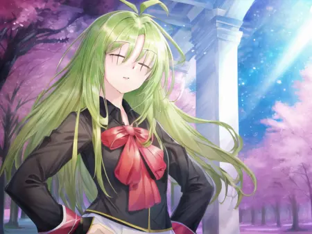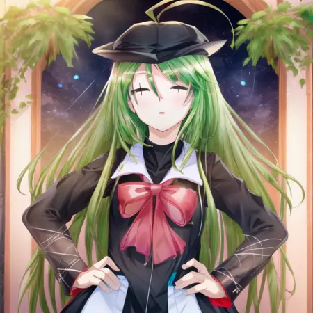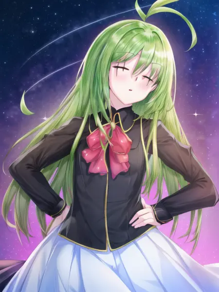 Trin,green hair,long hair,ahoge, black shirt, white skirt, cross eyes,red ribbon,standing, hand on hip, Close eyes,