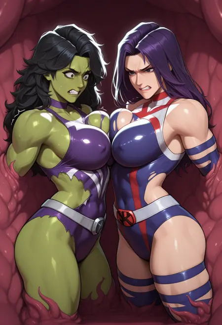 英雄女团已被邪恶触手怪物击败并屈服于其淫威!如今她们被囚禁在它的血肉巢穴中,不断被受孕并产下触手怪物!