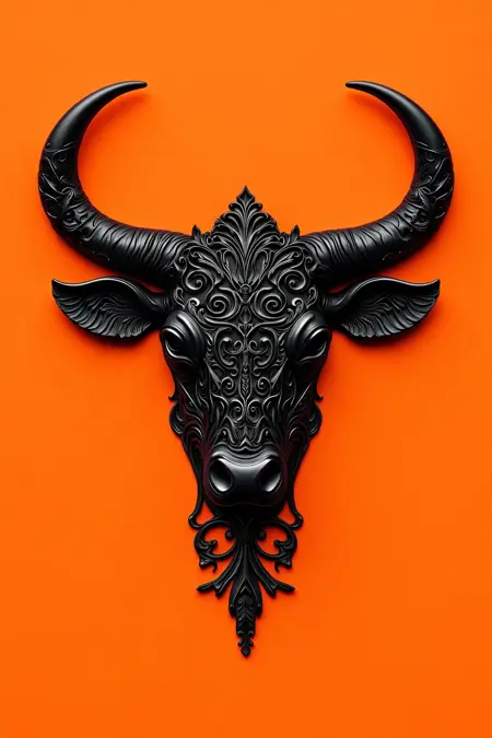 복잡한 검은 비잔틴 금속 섬세한 동물 디자인, 황소 두상, 주황 단색 배경, 대담한 패턴, 강렬한 느낌.