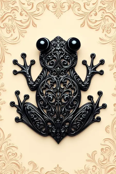 복잡한 검은 비잔틴 금속 섬세한 동물 디자인, 개구리 형태, 베이지 꽃무늬 배경, 작은 곡선, 양서류의 귀여움.