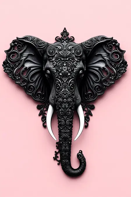 복잡한 검은 비잔틴 금속 섬세한 동물 디자인, 코끼리 두상, 분홍 부드러운 배경, 화려한 패턴, 웅장한 기운.