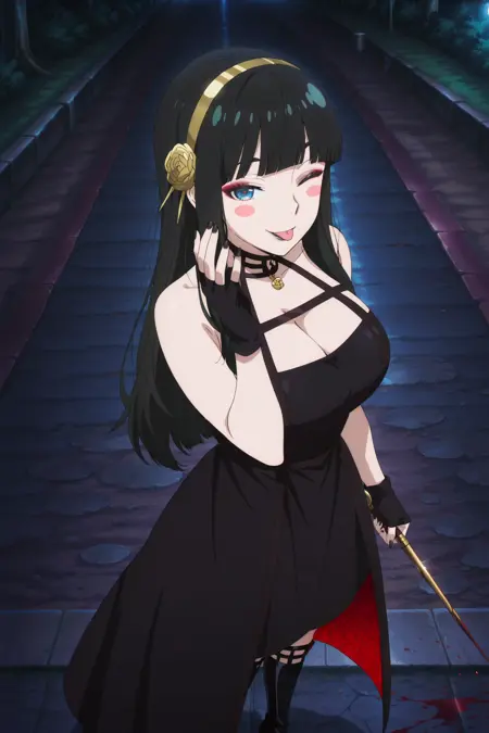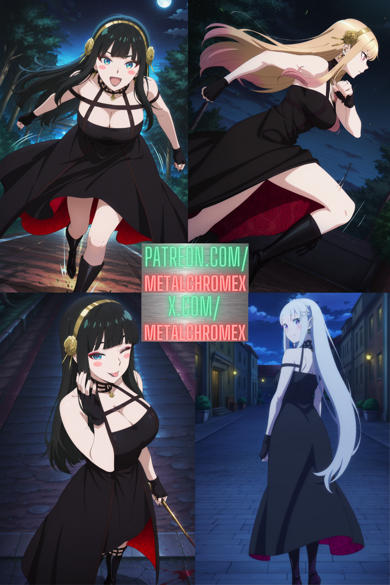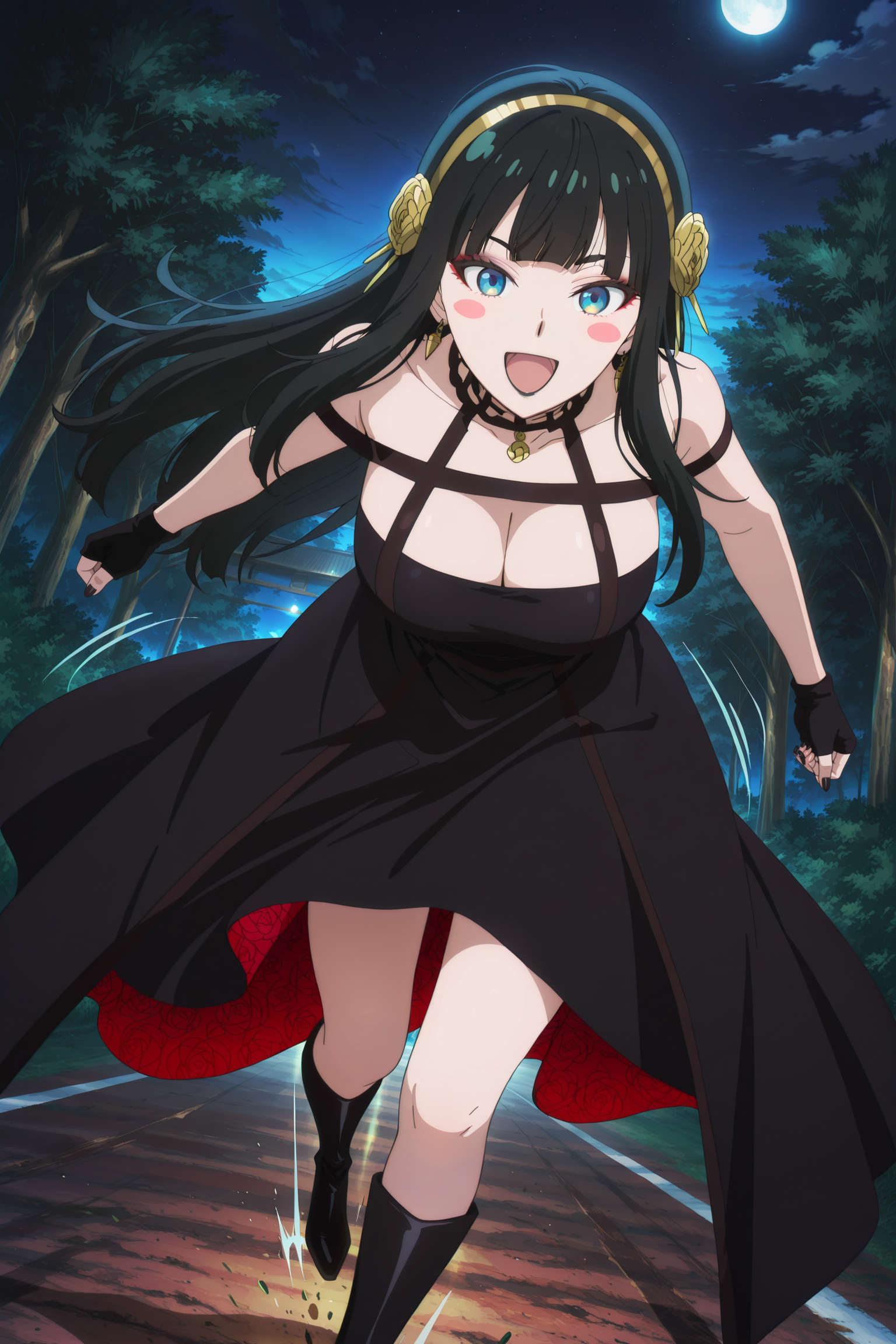 使用上のヒント:私が提供したタグ付きキーワードは、一般的に非常に良好に動作します。ただし、他の衣装LoRAと同様に、一部の要素はうまくいく場合とそうでない場合があります。最も大きな変数は、チョーカーと胸元をつなぐ腕のストラップですが、それ以外はヨルの衣装をかなり正確に再現しています!
