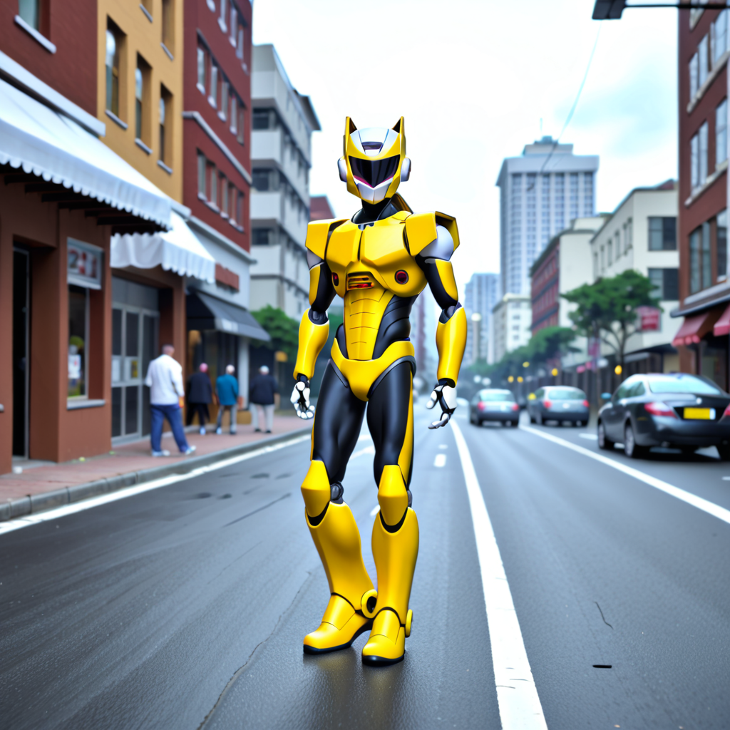 sleek red and white armor with green accents, long flowing golden hair