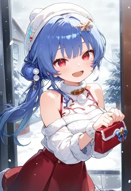 white hat,single hair bun,low side ponytail,bare shoulders,fur trim,collar,red skirt,white shirt,snowflake hair ornament,