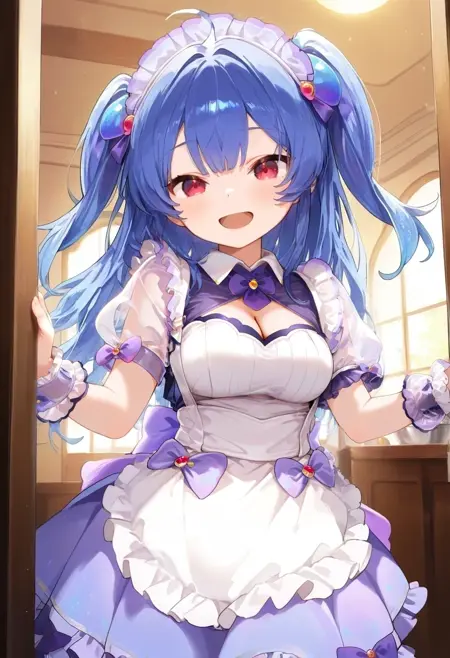 hair ornament,wrist cuffs,frills,two side up,maid headdress,puffy short sleeves,see-through sleeves,cleavage cutout,purple bow,