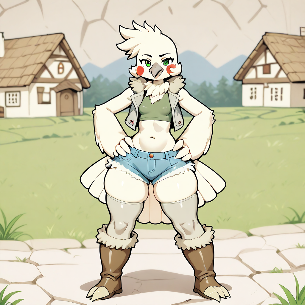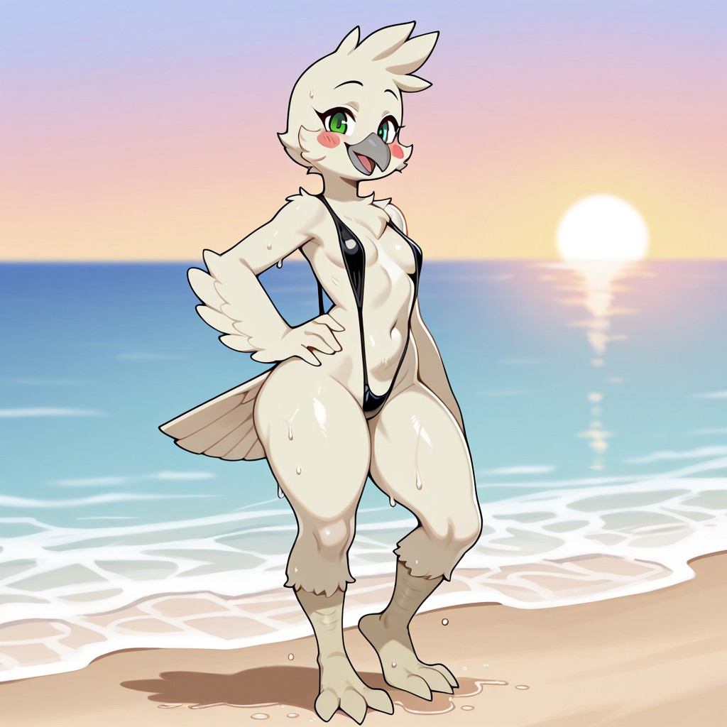 avian, bird girl, white body, green eyes, blush stickers, grey beak, bird tail, small breasts, thick thighs