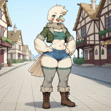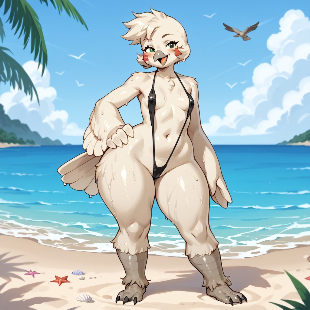 avian, bird girl, white body, green eyes, blush stickers, grey beak, bird tail, small breasts, thick thighs