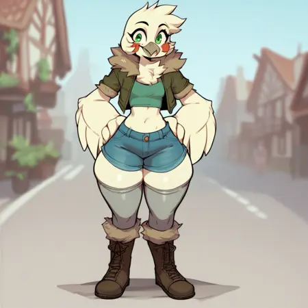 avian, bird girl, white body, green eyes, blush stickers, grey beak, bird tail, small breasts, thick thighs