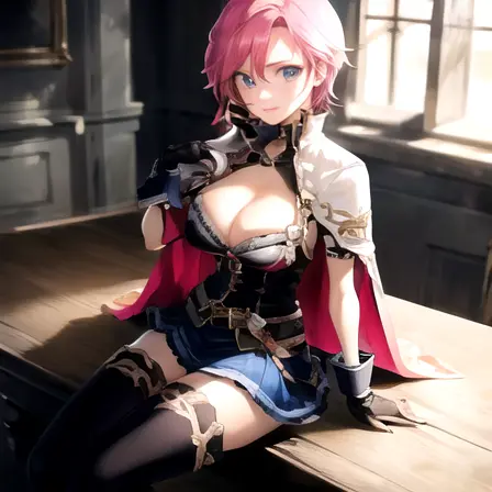 1girl, filo, 젖가슴 노출, 분홍색 머리, 허벅지 양말, 검, 망토, 장갑, 파란 치마, 짧은 머리, 파란 눈,
