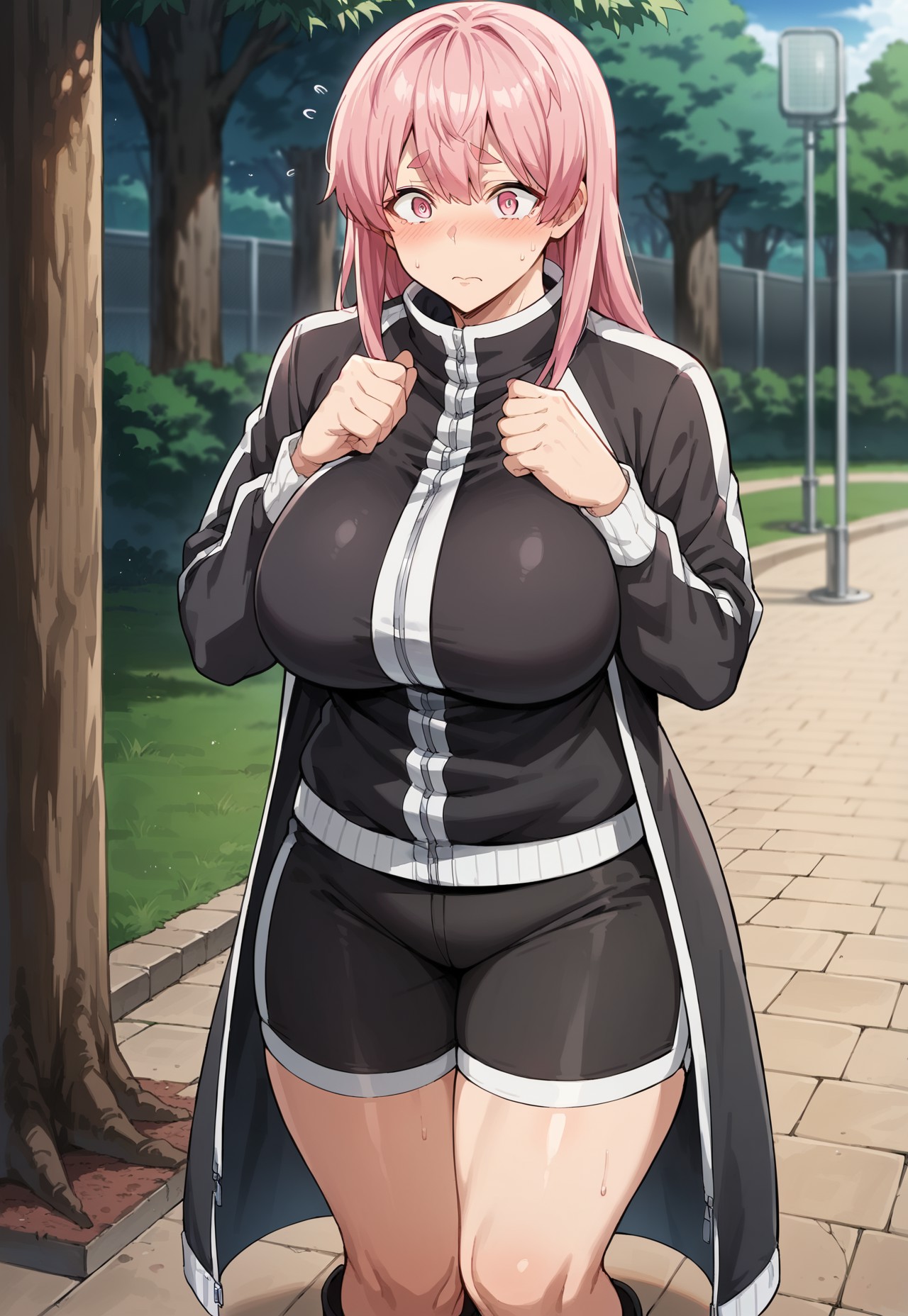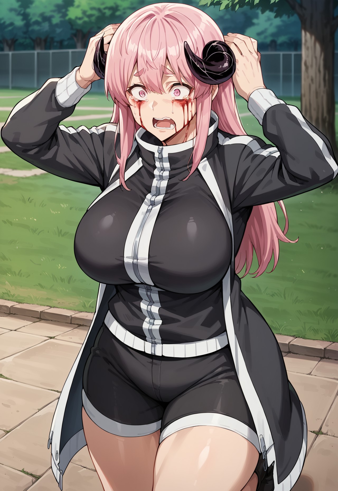 homare_byobugaura, pink hair, long hair, pink eyes, pink eyebrows, black horns, huge breasts, wide hips, thick thighs,