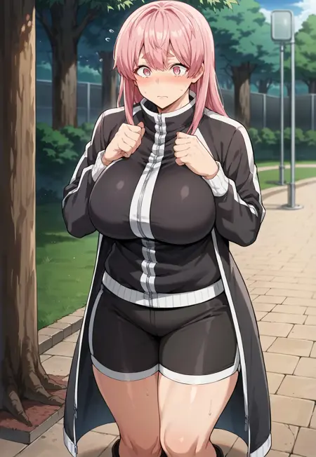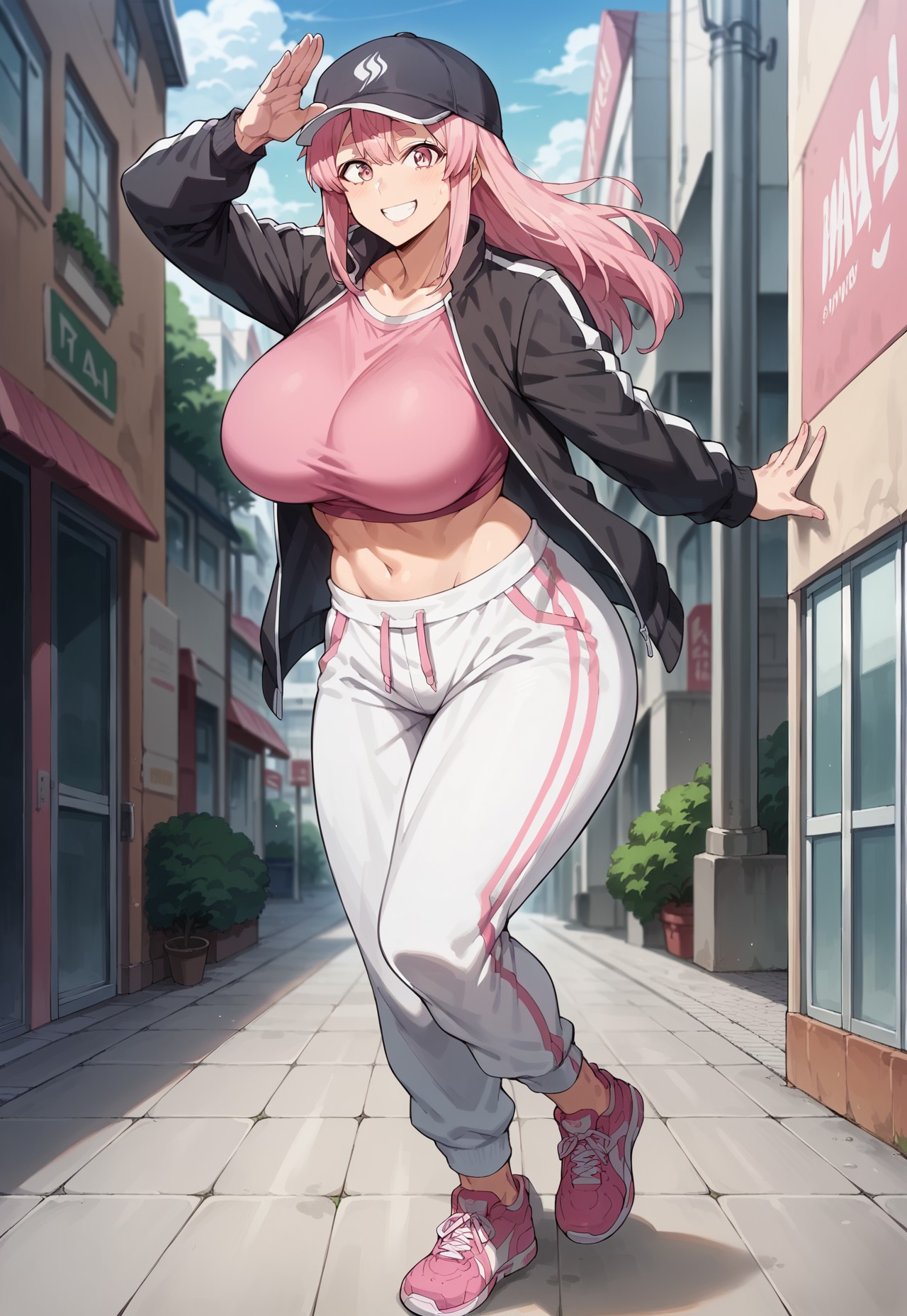 pink crop top, white sweatpants, black cap, black jacket, sneakers,
