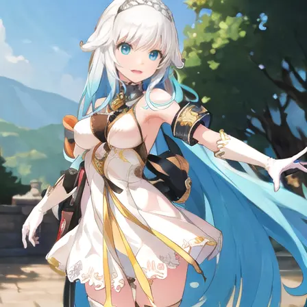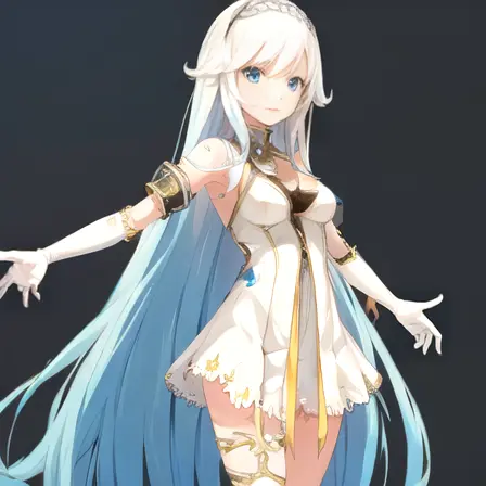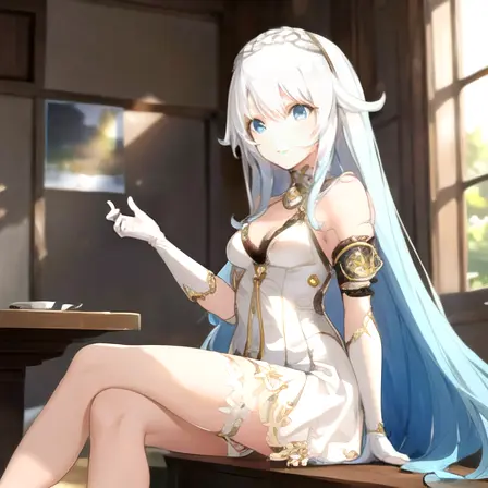 1girl,Airi,多彩发色,白发,蓝发,极长发,裸露肩膀,手套,发辫,肘部手套,白裙,大腿