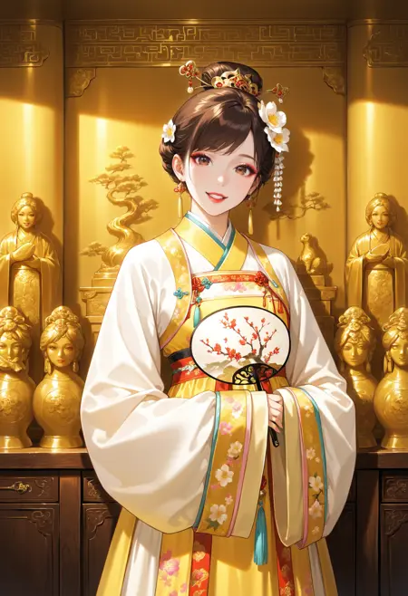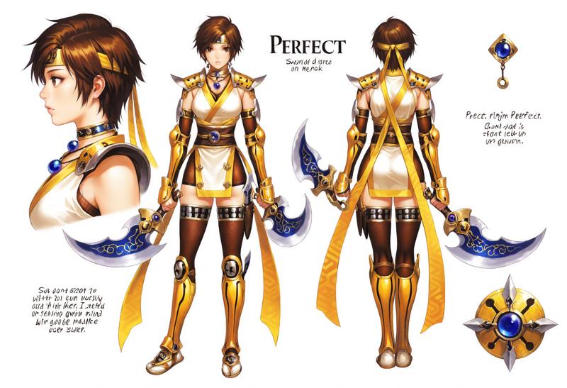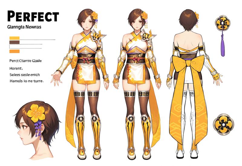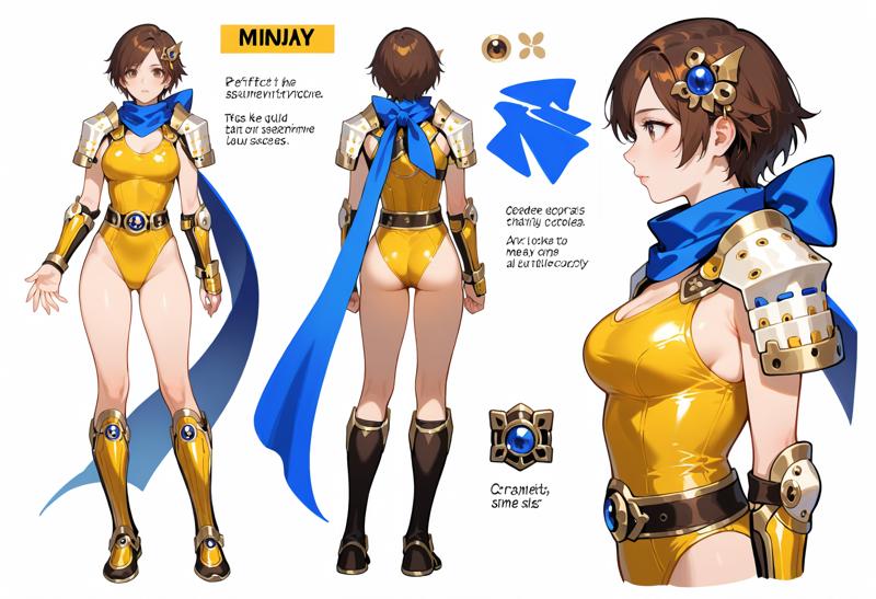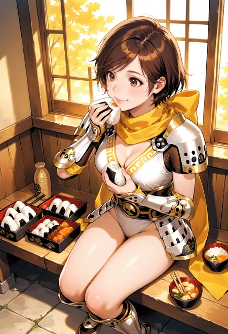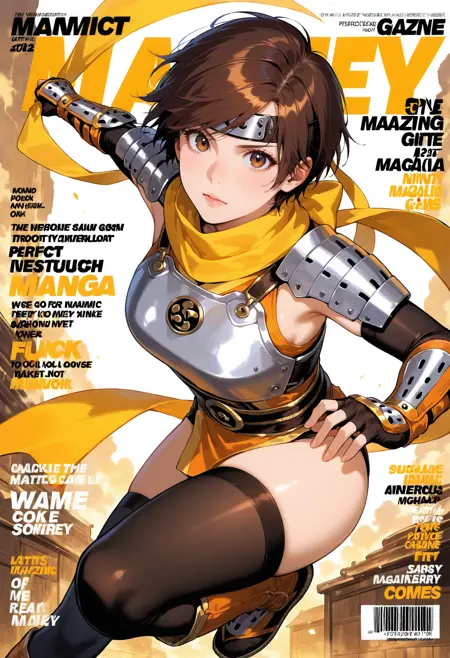 跨界服装2: 1girl,棕色眼睛,棕色头发,短发,发饰,忍者,乳房,中等大小乳房,围巾,蓝色围巾,肩垫,肩甲,盔甲,日本盔甲,紧身衣,黄色紧身衣,腰带,靴子,及膝靴,替代服装