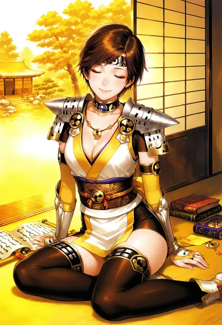 《战国无双3》服装: 1girl,棕色眼睛,棕色头发,短发,发带,忍者,围巾,胸甲,盔甲,手套,无指手套,肘部护具,及膝长筒袜,黑色及膝长筒袜,靴子