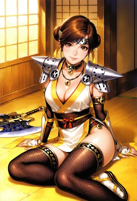《战国无双2》服装: 1girl,棕色眼睛,棕色头发,短发,发带,忍者,首饰,项链,项圈,乳房,中等大小乳房,盔甲,和服,腰带,及膝长筒袜,渔网袜,双持,反握,武器,小刀,剑