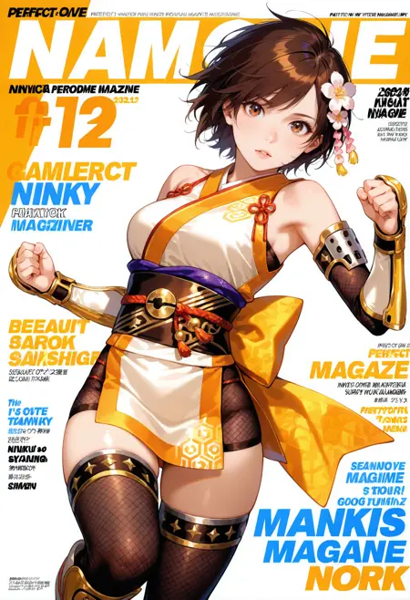 《战国无双4》服装: 1girl,棕色眼睛,棕色头发,短发,发饰,头发装饰品,乳房,忍者,中等大小乳房,露肩,盔甲,和服,和服,短款和服, detach袖,腰带,绝对领域,及膝长筒袜,渔网袜,靴子