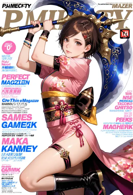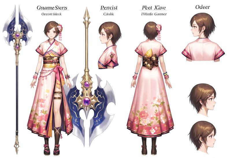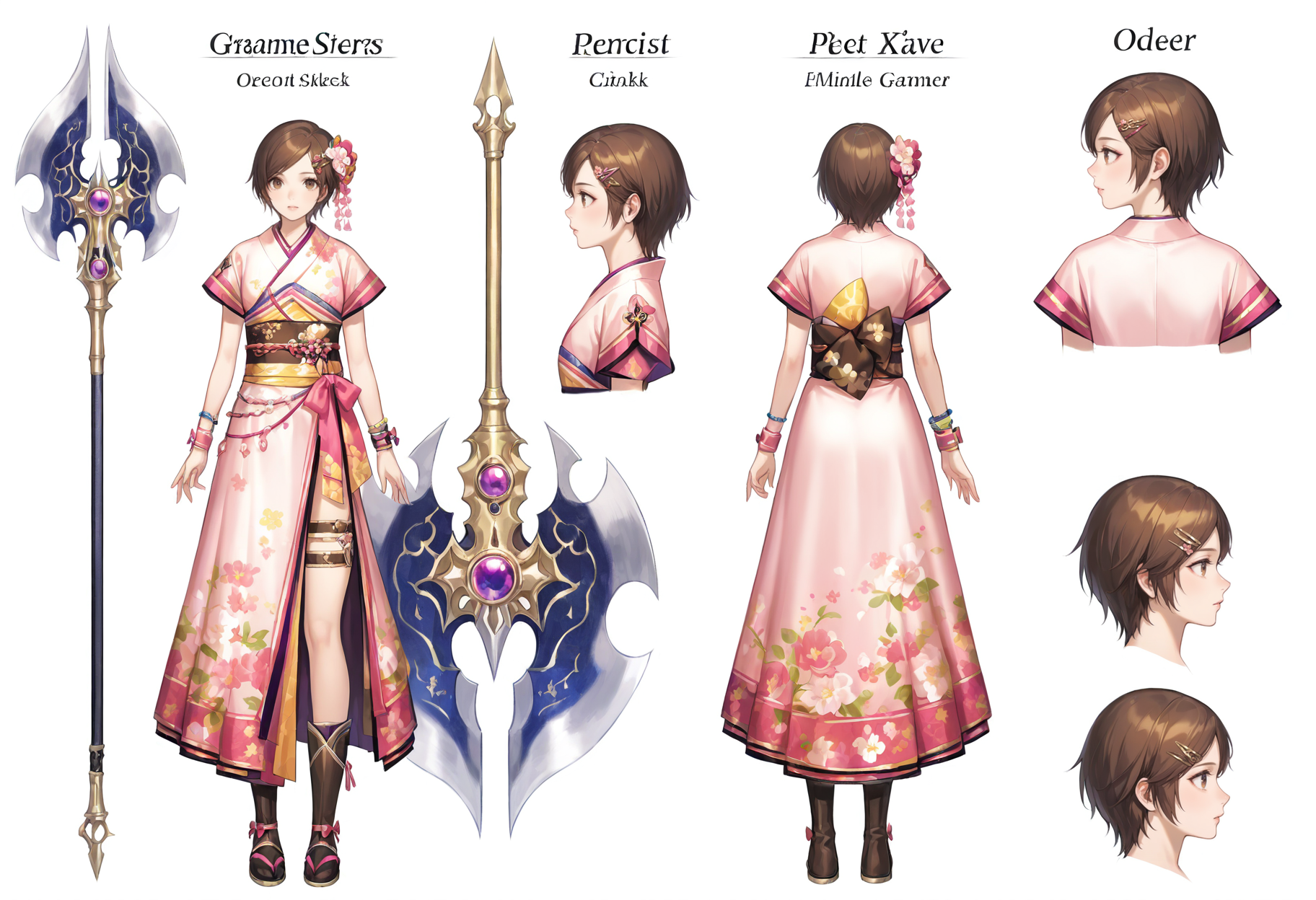 跨界服装4: 1girl,棕色眼睛,棕色头发,短发,发饰,蝴蝶结,丝带,发夹,首饰,手镯,腕带,和服,和服,腕甲,短袖,粉色和服,连衣裙,长裙,侧开叉,腰带,腰带,花卉图案,裙子,大腿绑带,靴子,凉鞋,足袋,战斧,替代服装,长柄武器,巨大武器