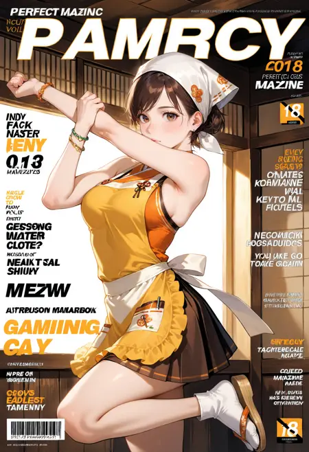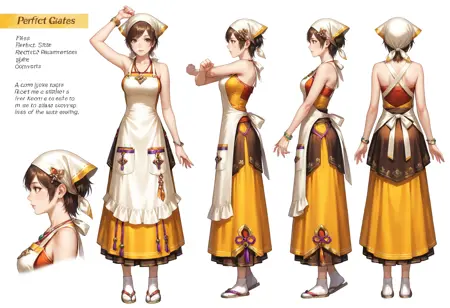 跨界服装3: 1girl,棕色眼睛,棕色头发,短发,头巾,首饰,伸展姿势,乳房,中等大小乳房,露肩,连衣裙,围裙,手镯,裙子,袜子,凉鞋,足袋