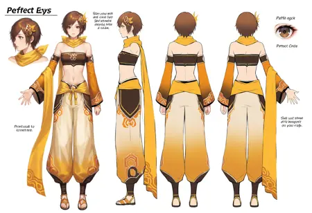 跨界服装1: 1girl,棕色眼睛,棕色头发,短发,紧身背心,发饰,露肩,围巾,束胸带,无吊带, detach袖,露脐,裤子,凉鞋
