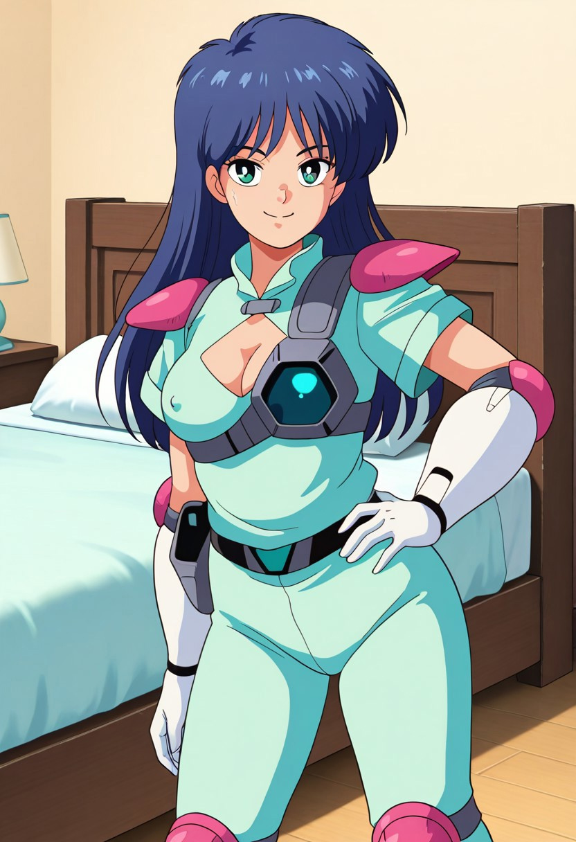 (佩戴未来感头戴设备和绿色探测器:1.3),深V领口,粉色肩垫,水蓝色短袖,水蓝色长裤,未来感胸甲(蓝白配色,装甲设计),