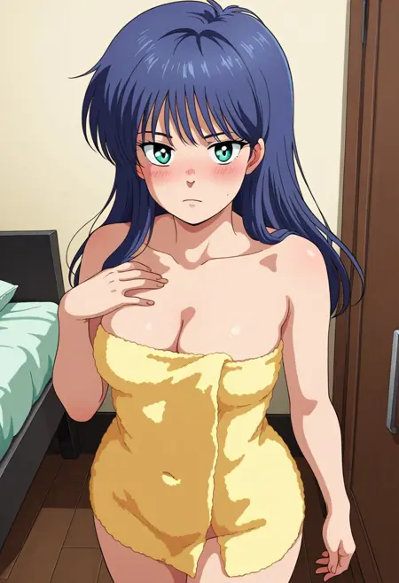 遮盖乳头,黄色毛巾,头巾,白色文胸,白色内裤,内衣,