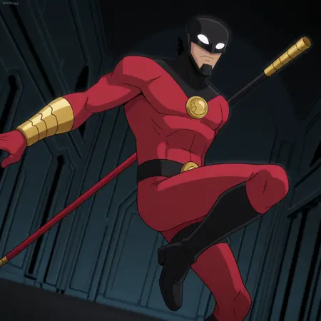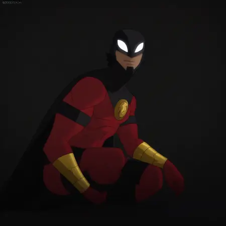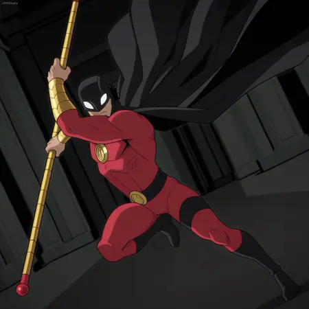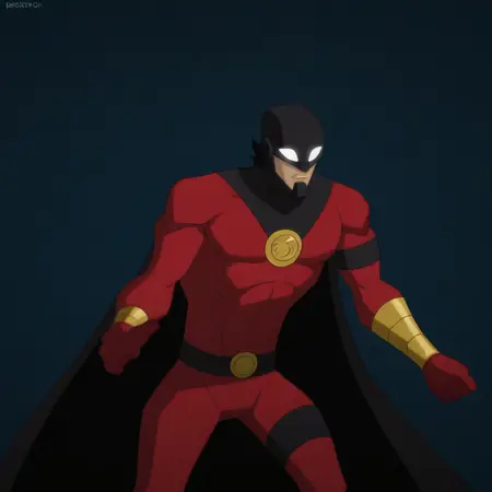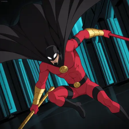 ロビン、男性、成熟した男性、筋肉質、黒いヘルメット、黒髪、白い目、赤いボディスーツ、黒いベルト、ゴールドのブレスレット、黒いブーツ、