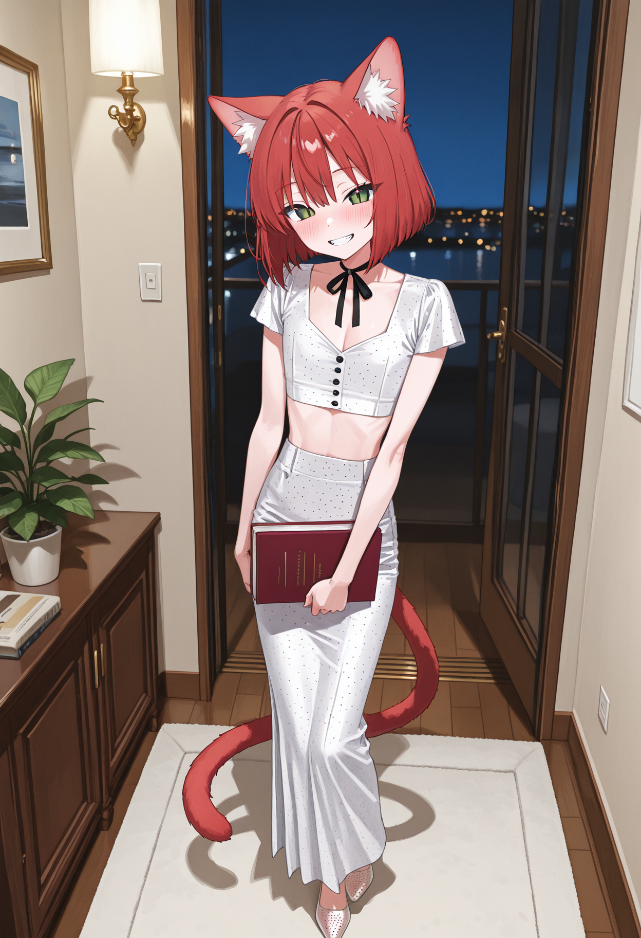 트리거 단어: 긴 치마, 크롭탑, 가슴 노출, 단발 팔, 목 끈, 복부, 새틴 옷, 폴카닷 무늬,