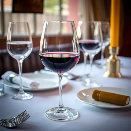 realism_cinema, a man and woman sitting at a dinner table with a glass of red wine and smartphone placed on marble surface, cinematic rim lighting, ultra realistic details, editorial photo, soft film grain, luxury product look