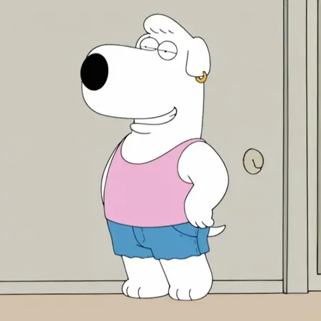 jasperfg, white fur, black nose, dog ears, gold earrings, tail, pink shirt, blue shorts, short, dog, 2D, flat colors, cartoon, short legs, black dot pupils,